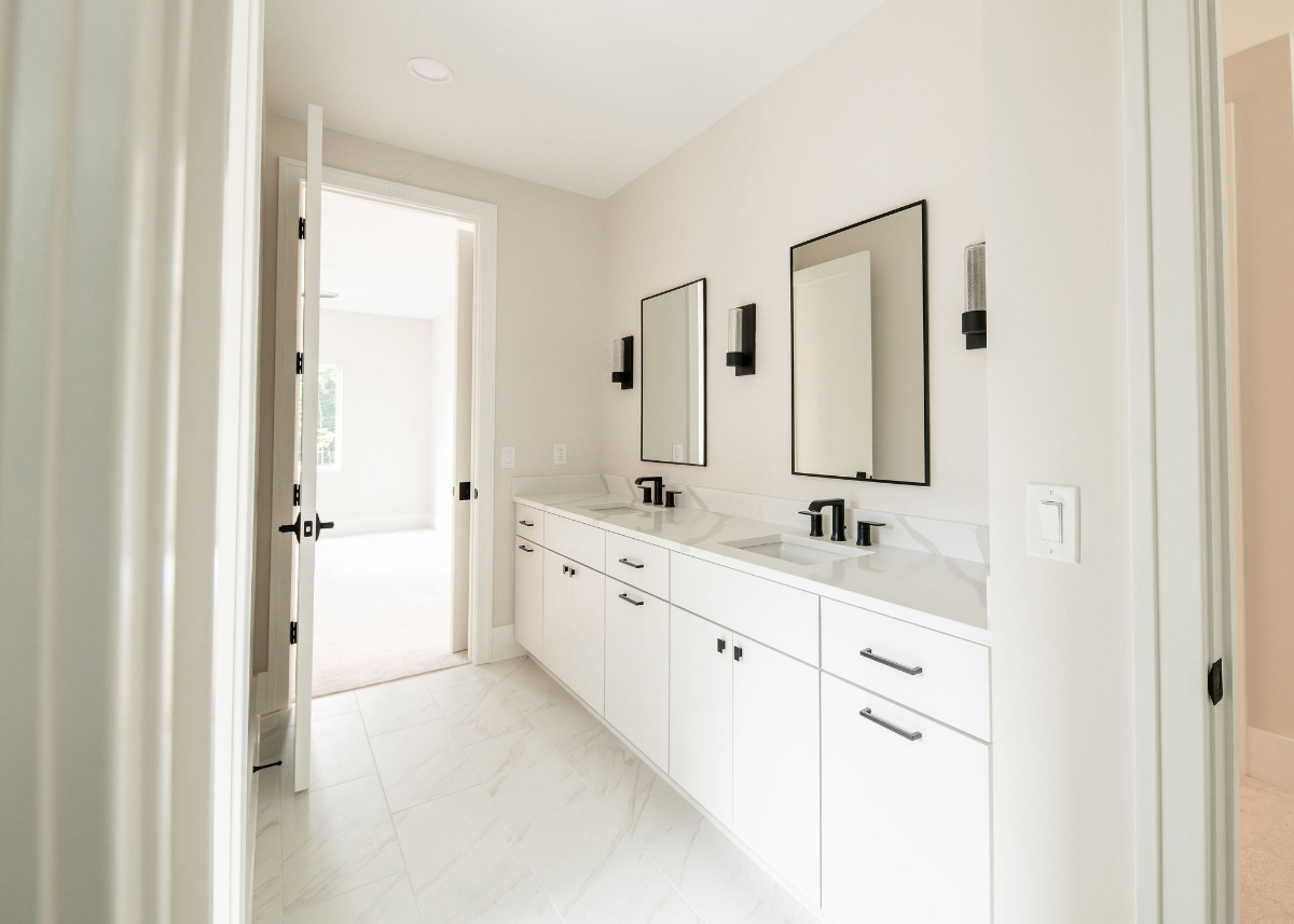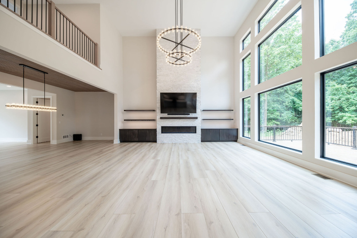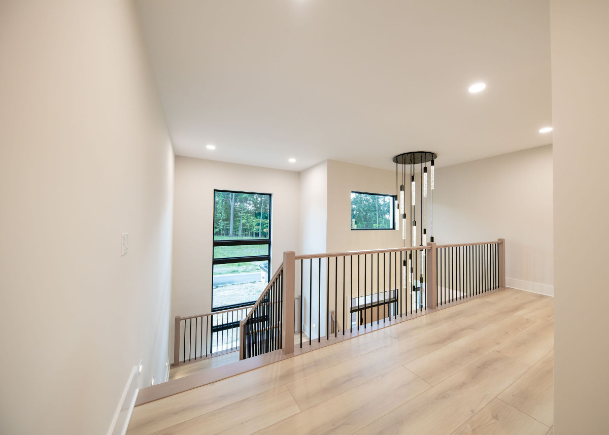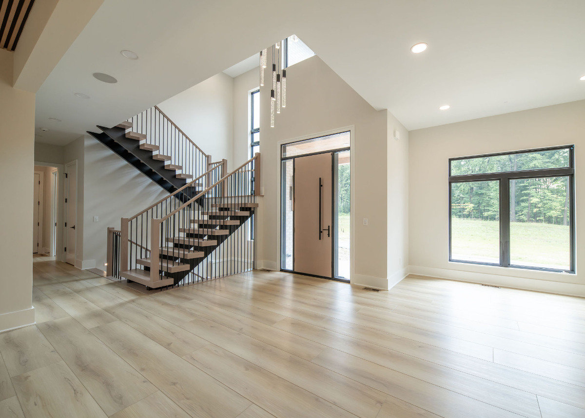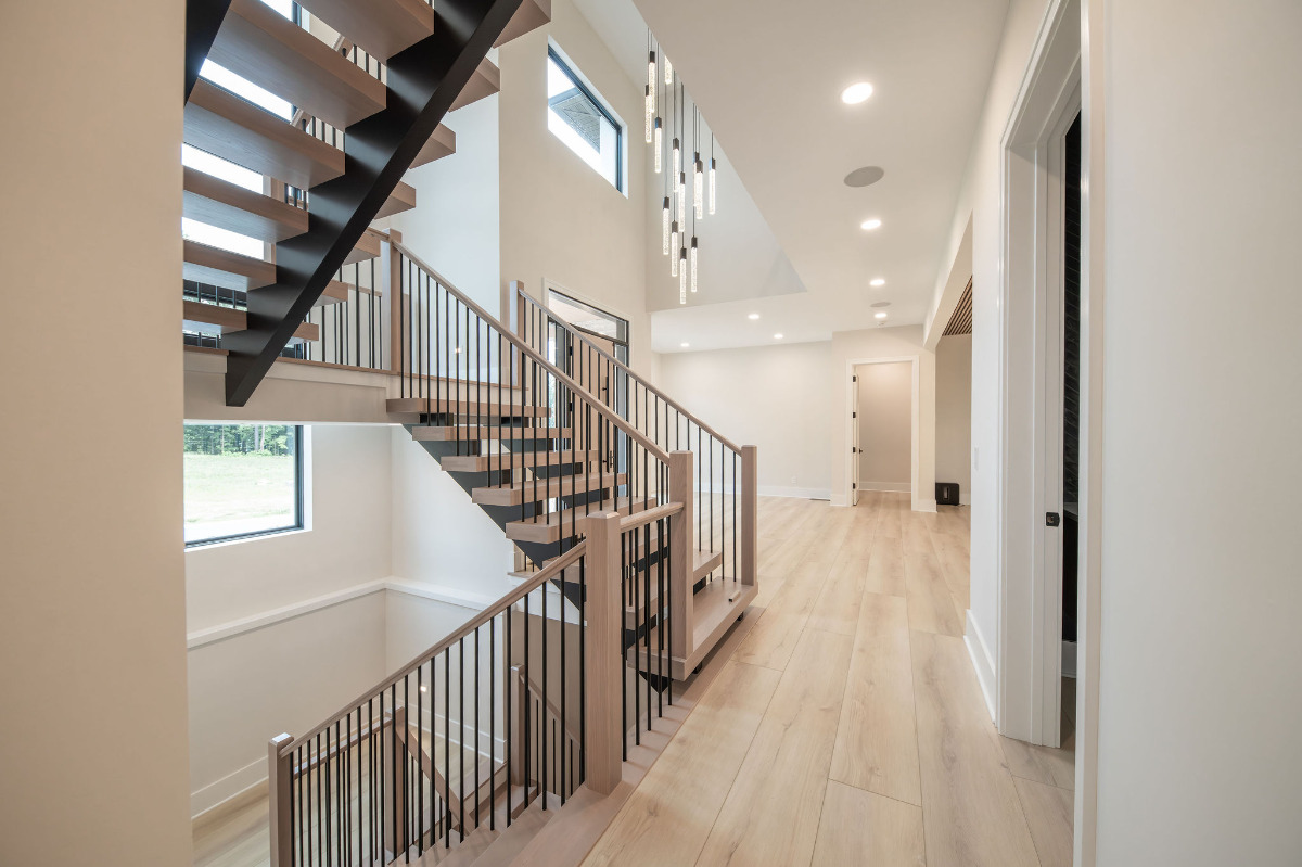 Lunar Ridge by Otero Signature Homes is a stunning contemporary new build located in Bainbridge Township, Ohio. Designed with a clean, minimalist aesthetic, this custom home features a calming neutral palette of off-whites, black, and natural white oak, creating a serene and cohesive environment throughout. Signature design elements include a breathtaking floating white oak staircase crafted as a sculptural focal point, a double-height fireplace wrapped in white crystal tile, and a built-up quartz waterfall island with a Freepower charging unit for elevated functionality. Thoughtfully curated finishes such as quartz full-height backsplash, stainless steel custom hood, champagne gold hardware, mixed metals, and custom cabinetry enhance both luxury and livability. Every detail was chosen to achieve a light and bright atmosphere without feeling sterile, showcasing Otero Signature Homes’ expertise in high-end modern custom design within the Greater Cleveland area.
